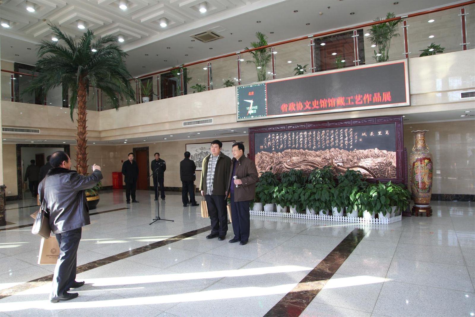 河北省文史馆馆藏作品展暨文史工作平台建设座谈会2013年12月29日在省会石家庄举行。县政协主席刘海明、郑氏砂艺公司总经理郑铁军、副总经理方永成应邀参加了本次活动。座谈会由省政协副主席曹素华主持,省政协主席付志方、省委常委、统战部长范照兵、省委常委、宣传部长艾文礼、副省长杨汭出席大会并做重要讲话。省政协副主席段惠军、崔江水、曹素华、 卢晓光、省政协秘书长郭大建以及省内著名书画家、艺术家近百人参加了参观和座谈会活动。兴隆县郑氏砂艺的《梅兰竹菊》、《脸谱组合》、《青山叠翠》、《花鸟牡丹》共7幅作品被省文史馆收藏。色彩靓丽的郑氏金银丝彩嵌砂画,赢得了省领导以及与会专家学者的高度赞赏。