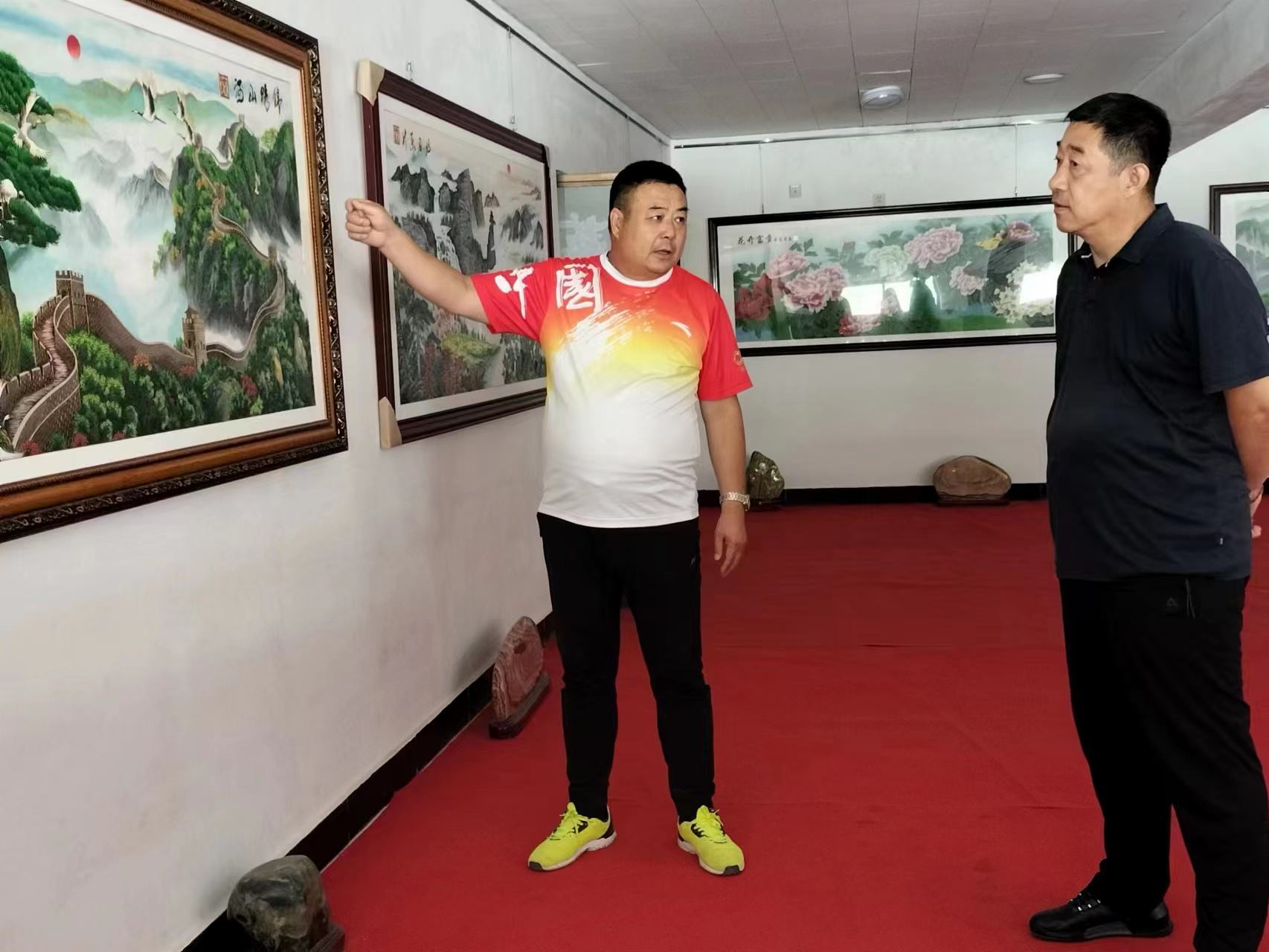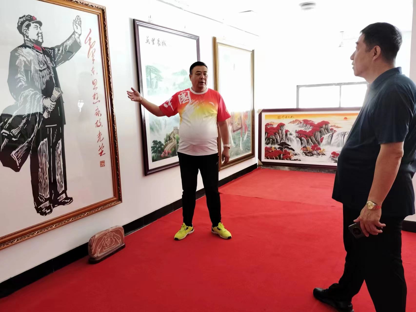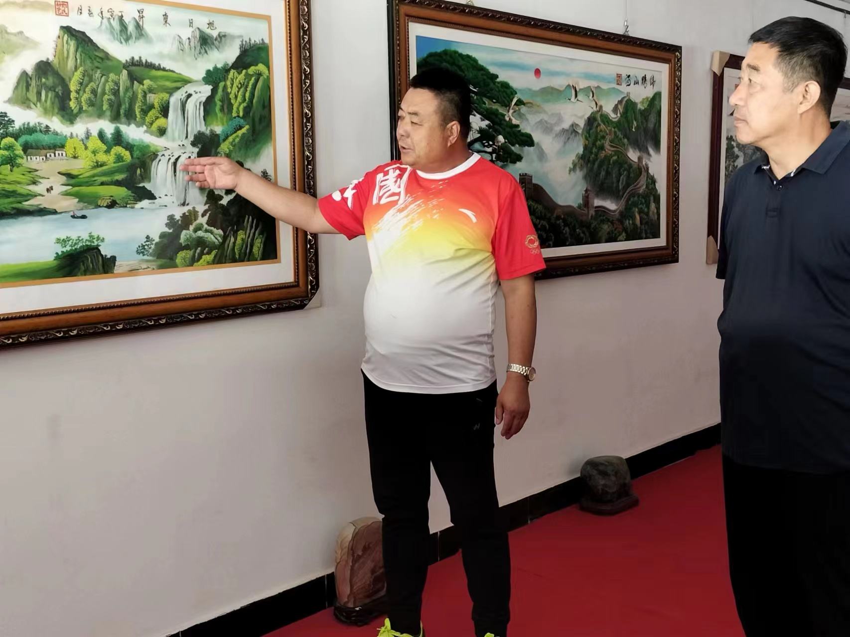 王智慧经理等人在郑总的陪同下参观了砂画制作车间和郑氏砂艺非遗文化展馆,参观过程中,郑总对郑氏砂艺(画)的发展历程、制作流程、企业荣誉和发展前景做了简单介绍。同时郑总就企业代表性砂画及其制作时采用的材料及背后的历史文化进行了简略描述。
