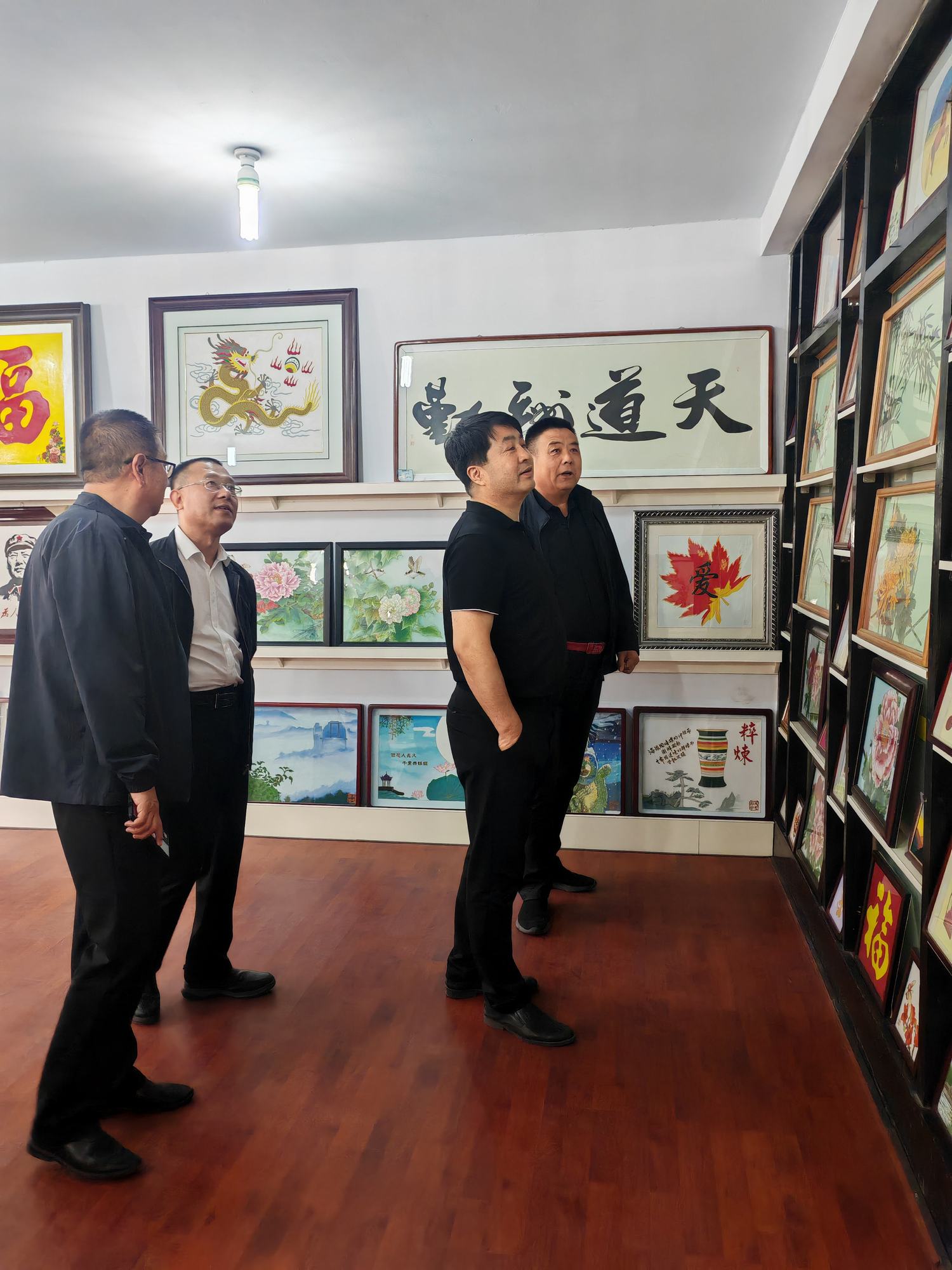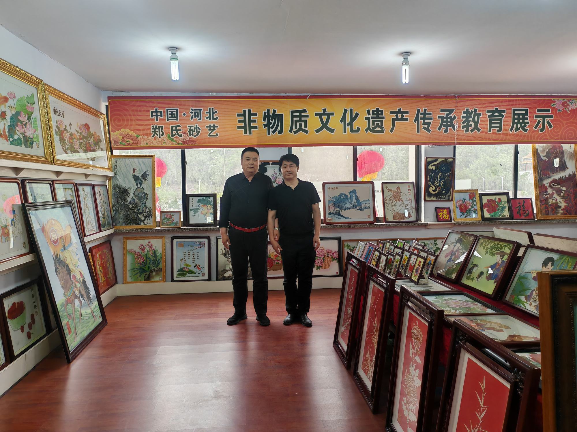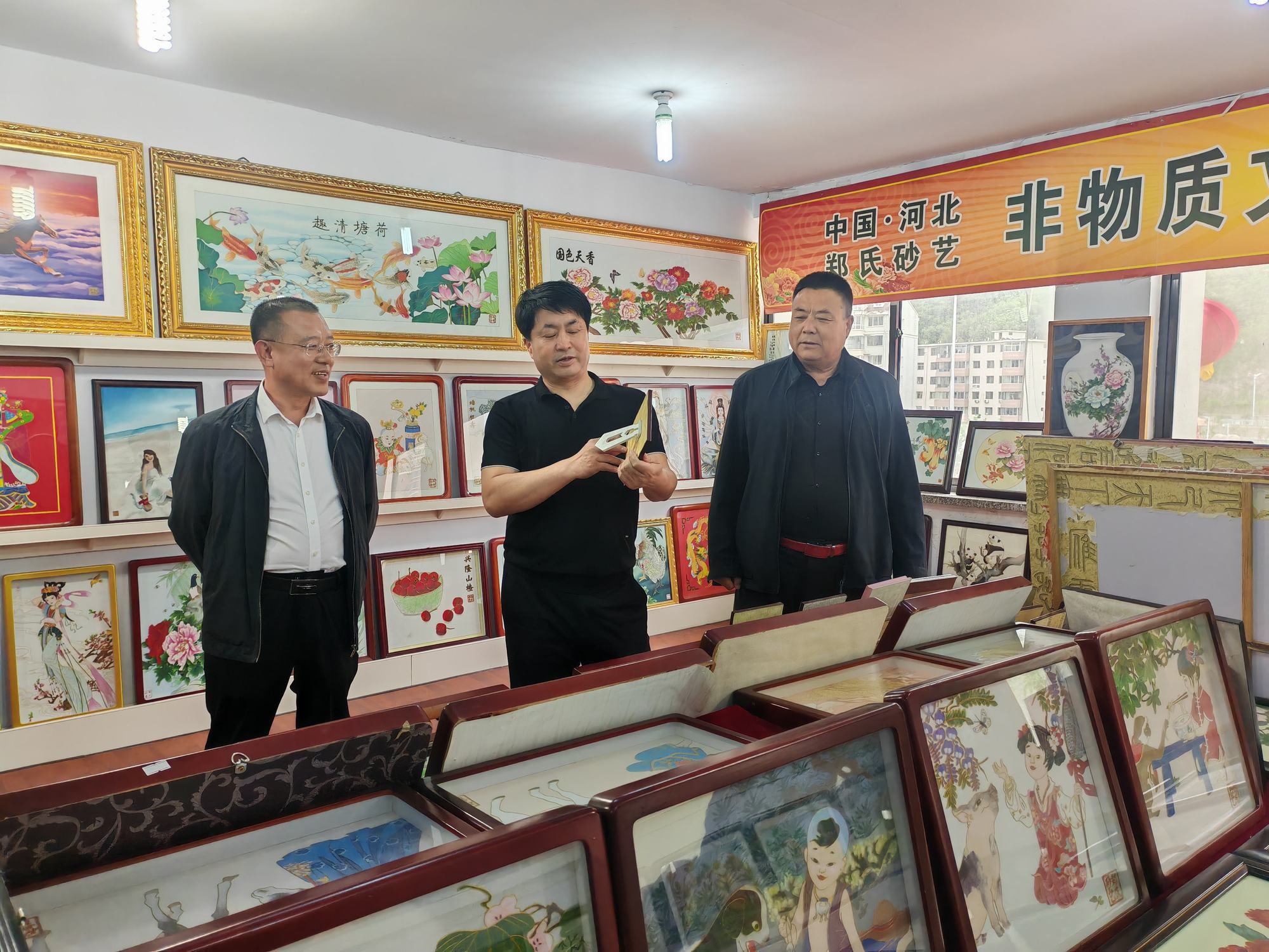 程志忠书记等一行在郑氏砂艺董事长郑铁军的陪同下,参观了郑氏砂艺非遗文化展馆,了解了郑氏砂艺非遗文化的传承和发展。随后,实地观察了郑氏砂艺(画)的制作过程,并与砂艺技师们进行了交流,了解了砂画制作原料和技艺手法。