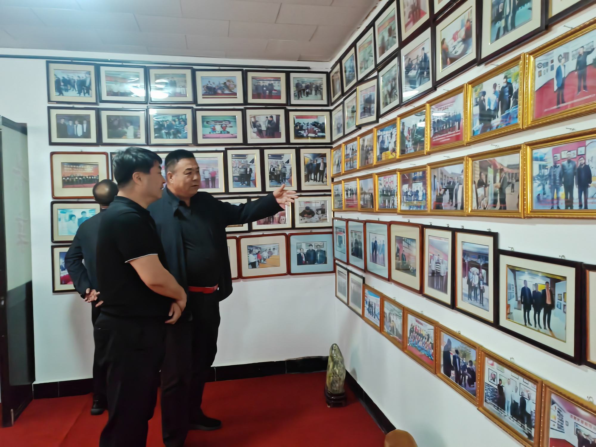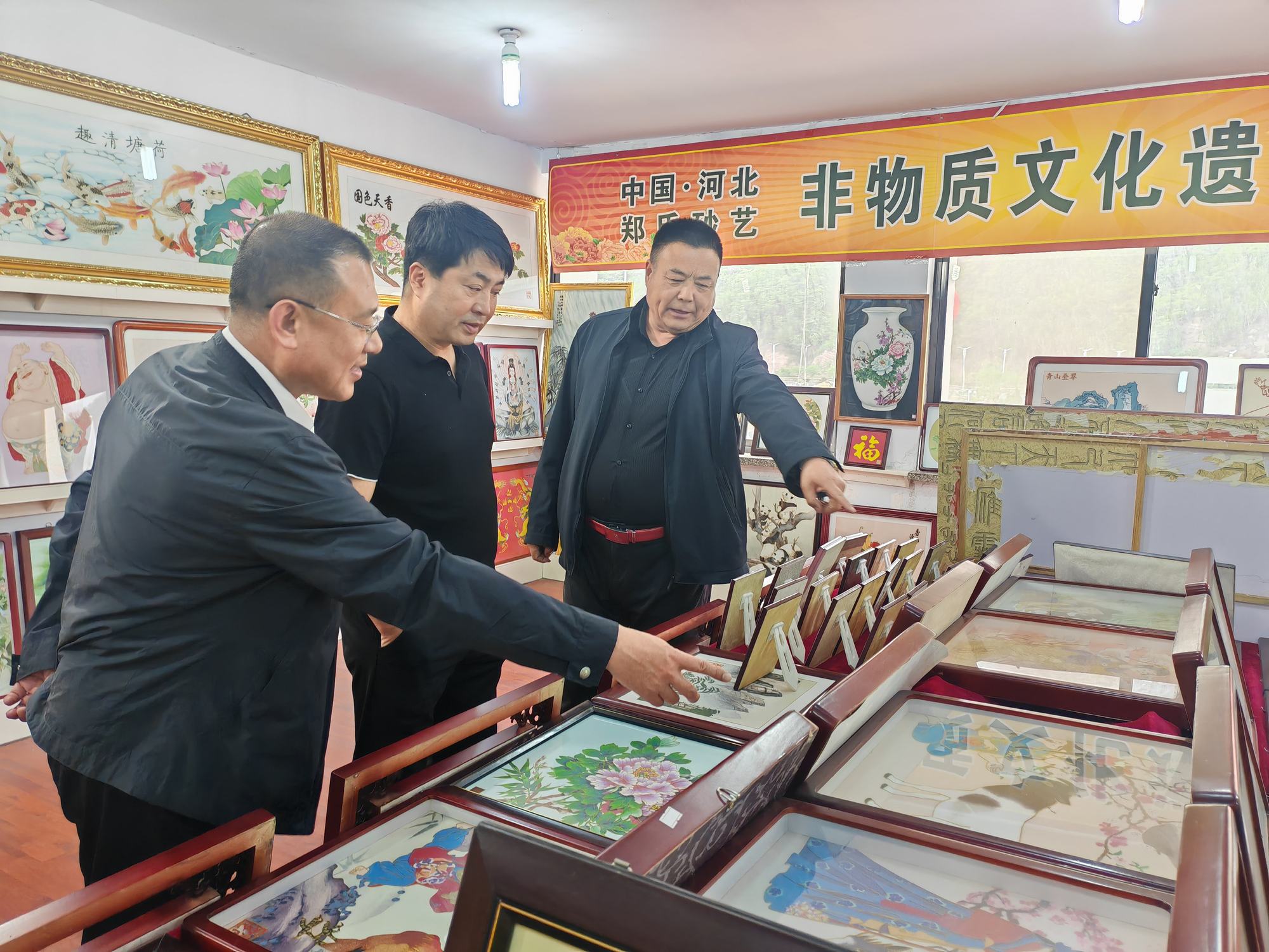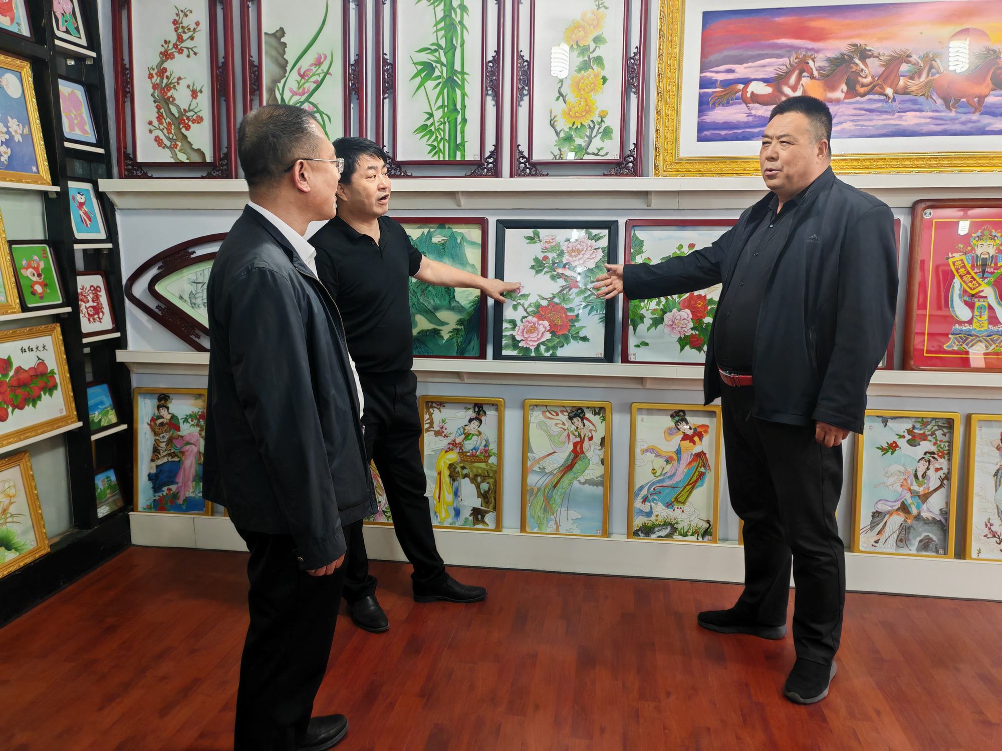 程志忠书记等一行在郑氏砂艺董事长郑铁军的陪同下,参观了郑氏砂艺非遗文化展馆,了解了郑氏砂艺非遗文化的传承和发展。随后,实地观察了郑氏砂艺(画)的制作过程,并与砂艺技师们进行了交流,了解了砂画制作原料和技艺手法。