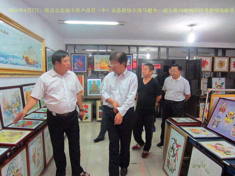 2014年8月7日,河北省总工会副主席卢彦君在县总工会主席王立群、县政协主席马健全、副主席刘海明、秘书长刘立强的陪同下,来到郑氏砂艺公司进行考察调研。