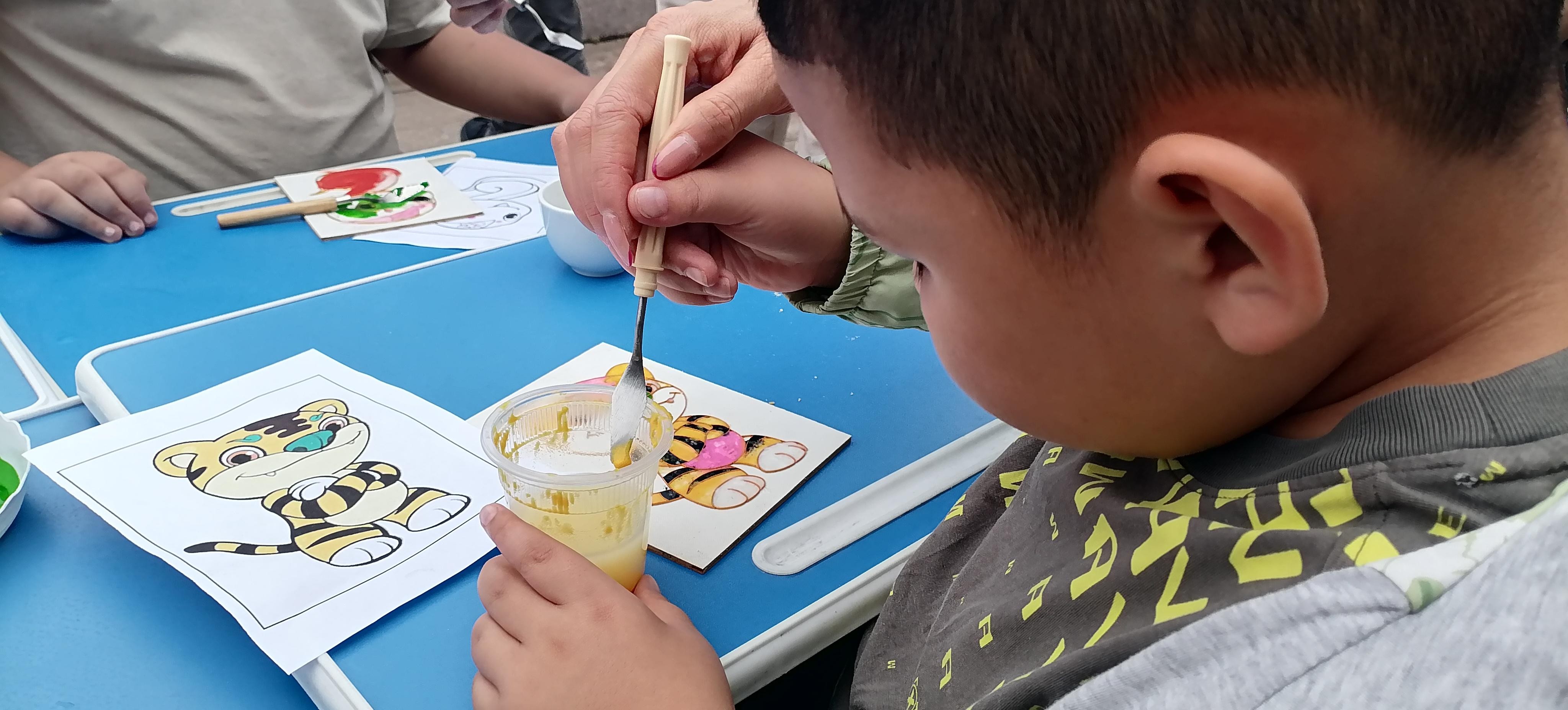 活动现场,郑氏砂艺的“天然彩砂+金银丝”工艺成为孩子们的“兴趣焦点”。作为兴隆县的省级非遗项目,郑氏砂艺以天然矿物彩砂为原料,采用金丝银线勾勒图案轮廓,再填充彩砂的传统手法,既保留了乡土文化特色,又蕴含着非遗技艺的巧思。为让孩子们轻松参与,技师们特意提前制作了粘好金丝的半成品——一幅幅待填充的砂画作品,将“最精彩的创作环节”留给孩子。“我要给小虎的脸涂绿色!”“我喜欢蓝色的眼睛!”孩子们围坐桌前,手持作画小铲,认真地将色彩砂石填入金丝框架,同时互相交流“配色秘诀”,现场充满了童真与热闹。