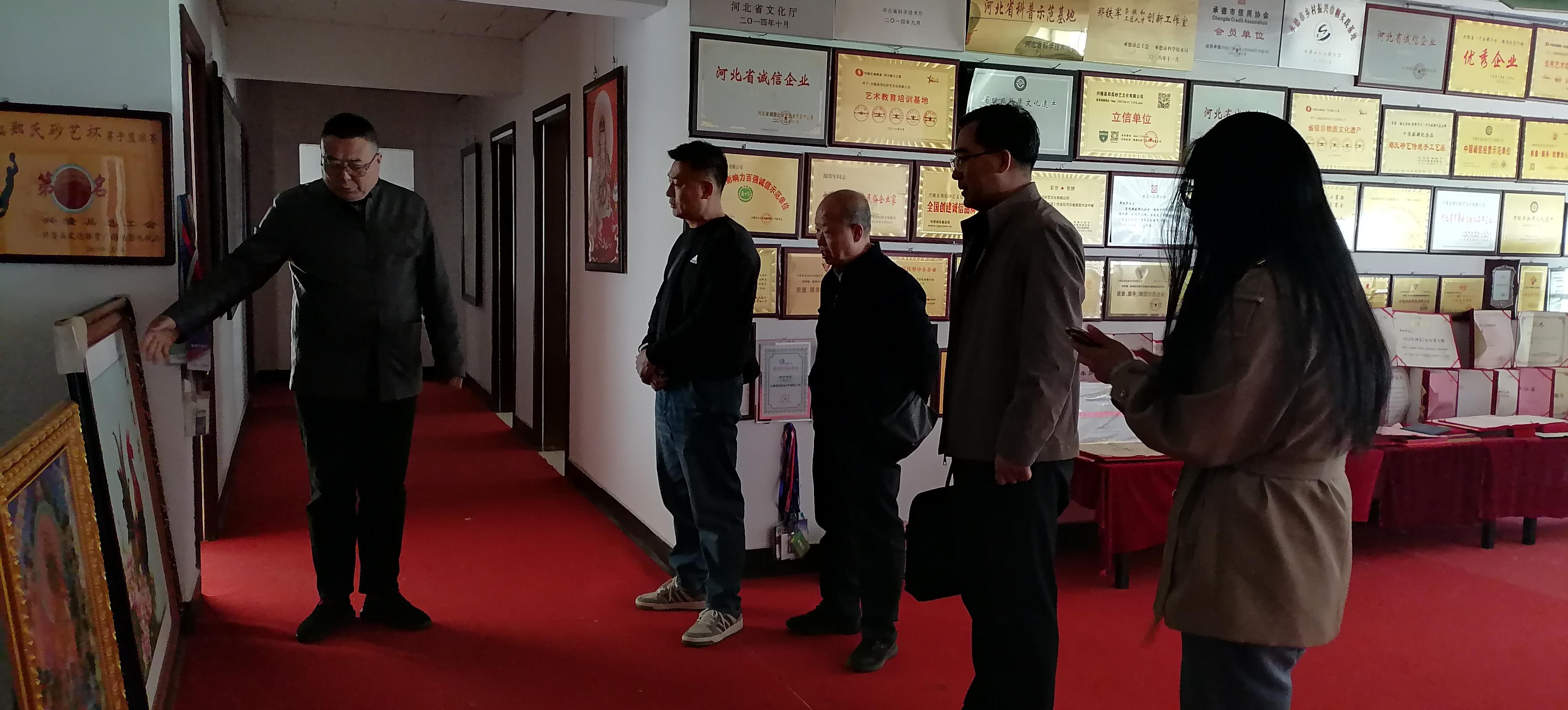 考察期间,王成山院长一行先后走进企业文化展示区、非遗作品展览馆,实地了解企业发展历程与技艺传承现状。郑铁军围绕郑氏砂艺的传承历史、技艺特点、发展成果逐一介绍,细致讲述了各类馆藏作品的创作历程、收藏价值以及获奖经历,全面展现了郑氏砂艺多年来坚守匠心、传承非遗的扎实成果。同时,他还展示了依托承德、兴隆本地历史文脉与地域特色文化打造的系列文创产品,体现了非遗技艺与地方文化融合创新的实践路径。