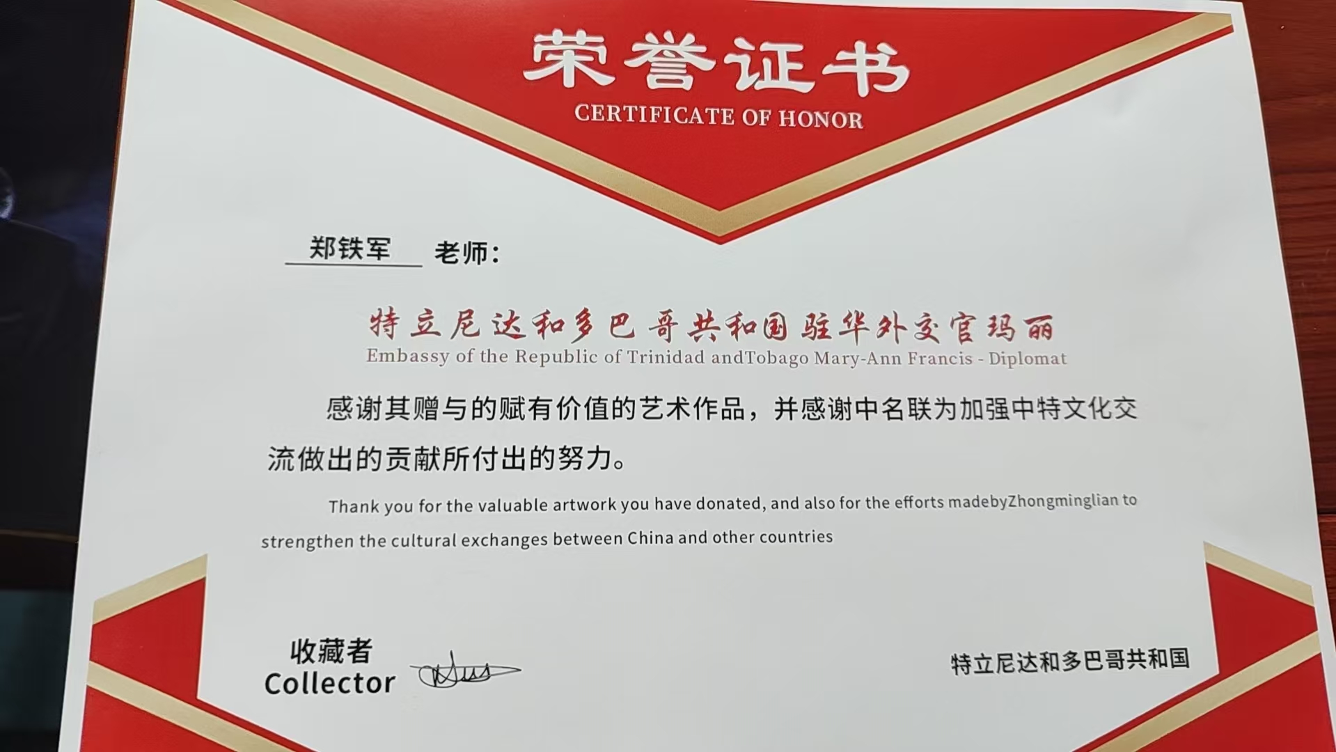 近日,应特立尼达和多巴哥共和国驻华大使馆的诚挚邀请,郑氏砂艺(画)形象代言人刘秀华女士携中名联签约国礼艺术家郑铁军老师的砂艺作品,踏入使馆殿堂,为两国文化交流增添了新的色彩。