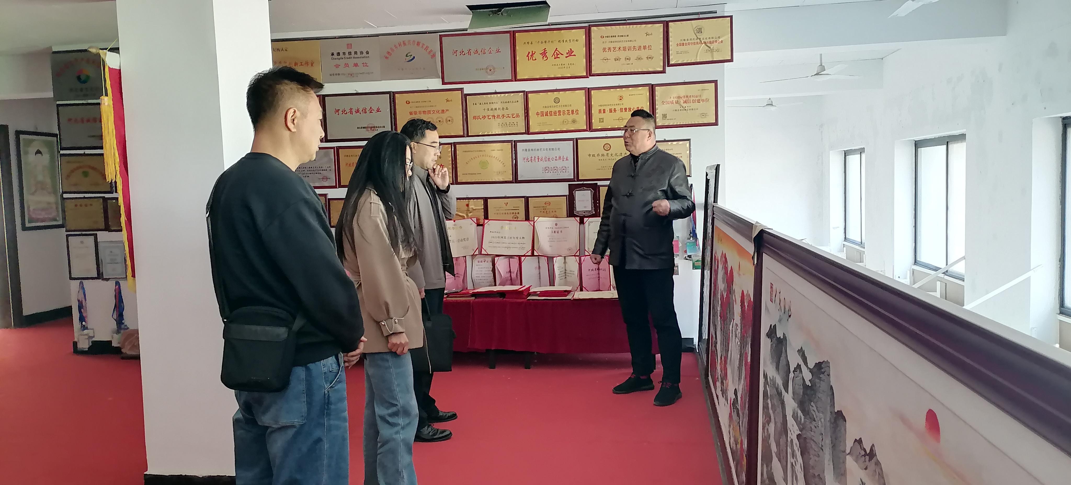 2026年3月28日,河北民族师范学院外国语学院党总支副书记、院长王成山,党总支副书记、纪检委员柴树金,党总支组织委员、副院长张永利,法语教师王晓宁莅临郑氏砂艺参观考察,实地调研省级非物质文化遗产郑氏砂艺的传承与发展情况。省级非物质文化遗产郑氏砂艺代表性传承人郑铁军全程陪同参观,并做详细讲解。